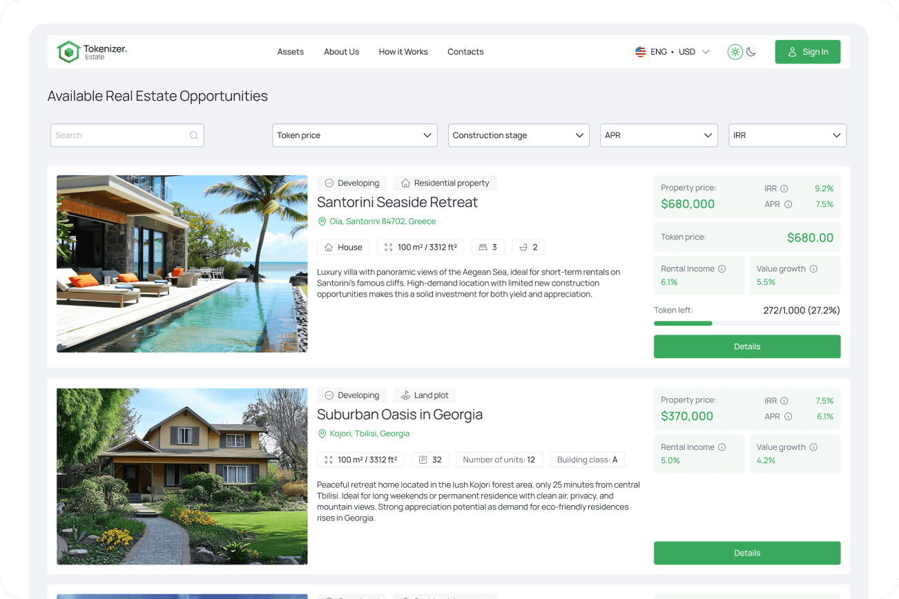 Invest in carefully vetted residential and commercial properties worldwide. Each asset comes with full documentation, verified data, and clear risk information—everything available in one click.